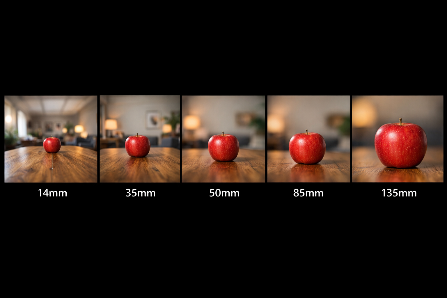 摄影教学对比图,同一室内场景,一张木桌上放着一个红色苹果,画面从上到下展示不同焦距下的视觉效果,对比图横向排列,共五个画面,场景完全一致,苹果位置不变,只有镜头焦距变化。