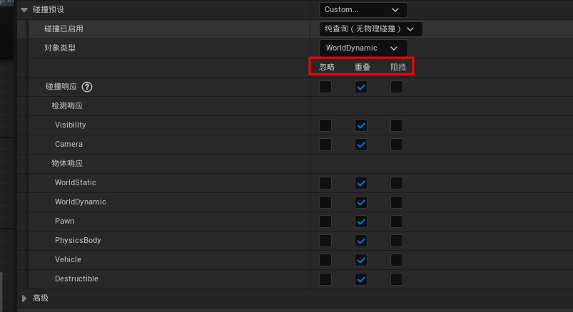 ECR_Ignore | 忽略 | 不会碰撞,也不会触发重叠事件 |